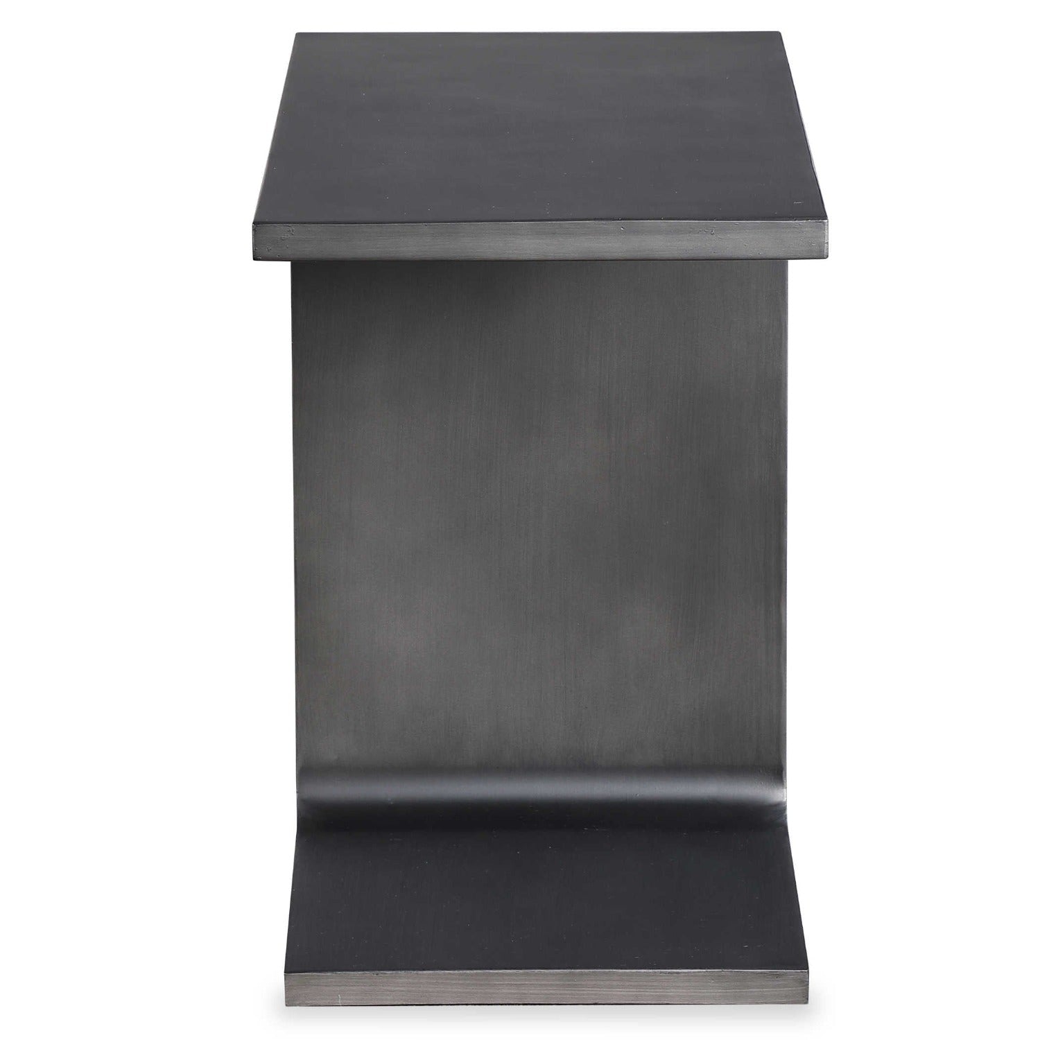 Inspired by modern cantilevered architecture, historic anvils, and "I beams", this industrial pull up table is finished in a blackened burnished steel. Designed to pull up as a side table or to create a layered look over a coffee table.